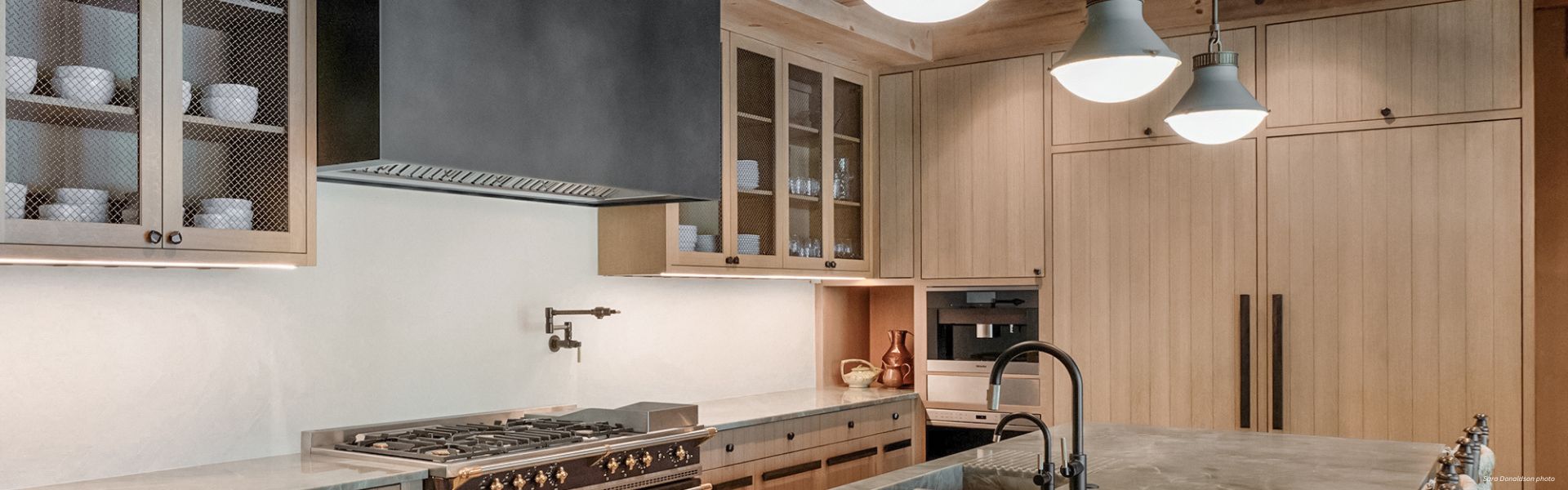 Modern kitchen featuring Banner Box Custom cabinets in light wood, stainless steel stove, glass-fronted doors with dishes, wall-mounted pot filler, built-in appliances, and pendant lights over a marble island with sink.